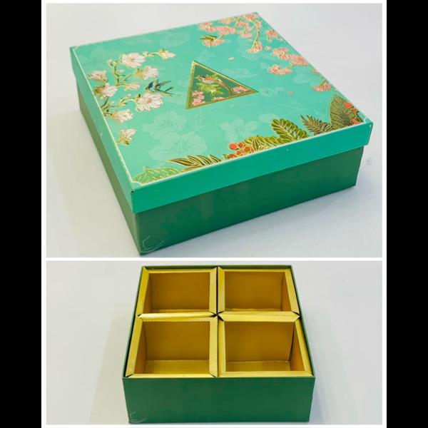 4 LADDU BOX Introducing our exquisite dry fruit box, a stunning blend of floral elegance and luxury, designed to make every occasion memorable. We are whole seller dry fruit boxes manufacturer in Delhi. Featuring a captivating floral-printed cover, this box opens to reveal four gleaming golden compartments, each meticulously crafted to hold a premium selection of dry fruits. Perfect for gifting. Make your memories special with REGARDS