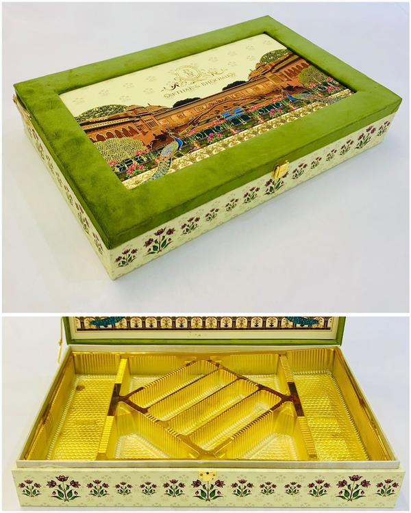 BHAJI BOX Introducing our elegant dry fruit gift box, the perfect blend of tradition and customization. This beautifully crafted box features four rectangular compartments surrounding a central rectangular compartment, allowing you to mix and match a variety of premium dry fruits to create a personalized gift. Elevate your gifting experience with this exquisite dry fruit box that’s sure to leave a lasting impression. We are manufacture in Delhi. all type dry fruit boxes.