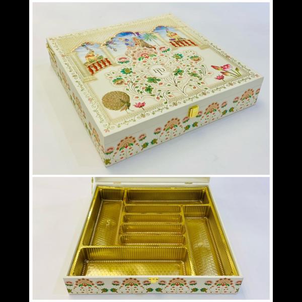 BHAJI BOX Introducing our elegant dry fruit gift box, the perfect blend of tradition and customization. This beautifully crafted box features four rectangular compartments surrounding a central rectangular compartment, allowing you to mix and match a variety of premium dry fruits to create a personalized gift. Elevate your gifting experience with this exquisite dry fruit box that’s sure to leave a lasting impression. We are manufacture in Delhi. all type dry fruit boxes.