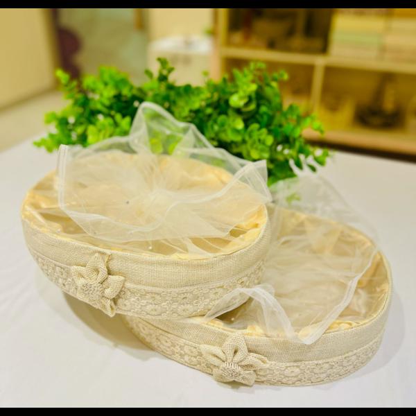 DRY FRUIT BASKET WITH NET Introducing our beautifully crafted potli basket, perfect for adding a touch of elegance to any gift-giving occasion. This unique basket features a delicate net cover to keep your items secure and a charming flower at the centre. this potli an eye-catching choice for presenting gifts this potli basket ensures that your gift stands out with its blend of functionality and style. we are whole seller of dry fruit boxes manufacturer at Delhi. Elevate your gift-giving experience with this exquisite and versatile potli basket, designed to impress and delight.