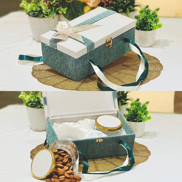 DRY FRUIT BOX Discover the perfect gift with our beautifully designed dry fruit box. Ideal for any special occasion Delight your loved ones with a gift that embodies taste, tradition, and health.. This elegant box includes four tin jars with the printed tin covers with silicon strips to handle. our dry fruit box offering both luxury and a health-conscious treat. We are whole seller dry fruit boxes in Delhi.