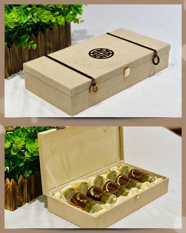 DRY FRUIT BOX Introducing our luxurious dry fruit box, designed to be the quintessential gift for any occasion with a delightful texture and secured with handle for durability, we are dry fruit box manufacturer in Delhi. this box exudes elegance. Inside, it features five glass containers, each adorned with tin printed caps. Lets make every occasion memorable with your love ones.