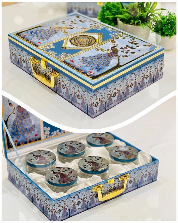 DRY FRUIT BOX Introducing the "Dry Fruit Box, " a beautifully crafted product designed specifically for storing dry fruits. With ample space and exquisite wooden craftsmanship. This exquisite set features six glass jars adorned with intricately printed tin caps, making it a tasteful choice for gifting. We are dry fruit manufacturer in Delhi.