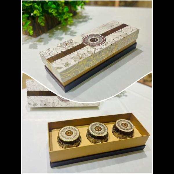DRY FRUIT BOX Introducing the "Dry Fruit Box, " a beautifully crafted product designed specifically for storing dry fruits. With ample space and exquisite wooden craftsmanship. This exquisite set features three pet jars adorned with intricately printed caps, making it a tasteful choice for gifting. we are whole seller manufacturer in Delhi.