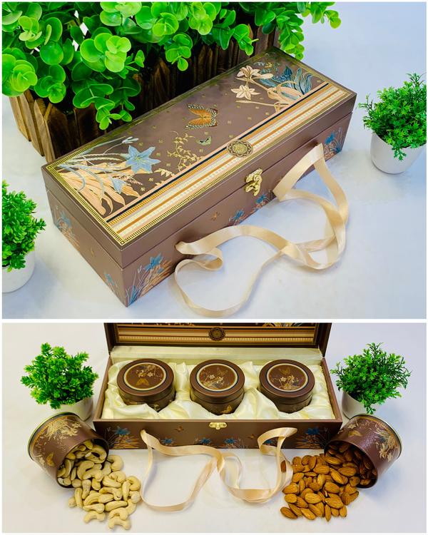 DRY FRUIT BOX Introducing the "Wooden Dry Fruit Box, " a beautifully crafted product designed specifically for storing dry fruits. With ample space and exquisite wooden craftsmanship. This exquisite set features three tin jars adorned with intricately printed tin caps, making it a tasteful choice for gifting. We have wide variety of dry fruit boxes manufacturer at Delhi.