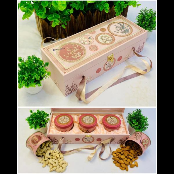 DRY FRUIT BOX Introducing the "Wooden Dry Fruit Box, " a beautifully crafted product designed specifically for storing dry fruits. With ample space and exquisite wooden craftsmanship. This exquisite set features three tin jars adorned with intricately printed tin caps, making it a tasteful choice for gifting. We have wide variety of dry fruit boxes manufacturer at Delhi.