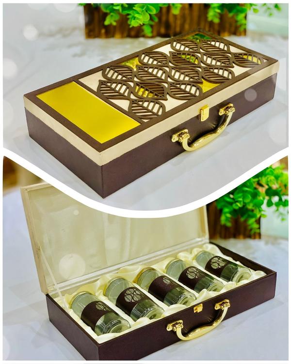 DRY FRUIT BOX This exquisite box features four elegant glass bottles, each adorned with intricate floral prints that embody sophistication and charm. Perfect for gifting on birthdays, holidays, or as a thoughtful gesture of gratitude Introducing our exclusive Dry Fruit Box, meticulously designed to elevate any occasion with its luxurious appeal, We will supply you goods in bulk and will also customize as per your choice we are manufacture in Delhi.