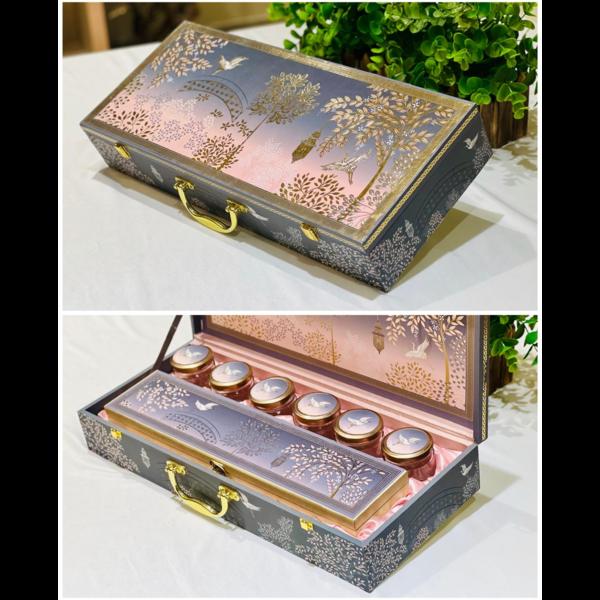 DRY FRUIT BOX we are manufacture in Delhi Discover the epitome of elegance and taste with our rectangular-shaped dry fruit box, adorned in a stunning ethnic printed design that exudes charm and sophistication featuring six glass tin jar that house an assortment of premium dried fruits, ensuring freshness and flavor with every selection. Nestled at its heart is a specially designated space for our signature sweet item With cavity perfect for storing different treats or keepsakes