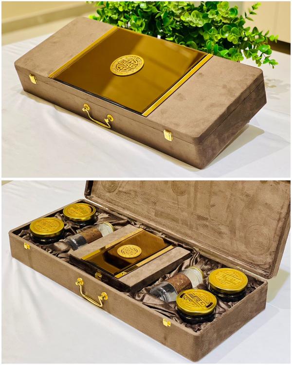 DRY FRUIT HAMPER BOX Discover the epitome of elegance and taste with our rectangular-shaped dry fruit box, adorned in a stunning ethnic printed design that exudes charm and sophistication featuring two spacious long glass containers that house an assortment of premium dried fruits, ensuring freshness and flavor with every selection. Nestled at its heart is a specially designated space for our signature sweet item we are whole seller manufacturer in Delhi. What sets our box apart are the four additional cylindrical glass containers, perfect for storing different treats or keepsakes
