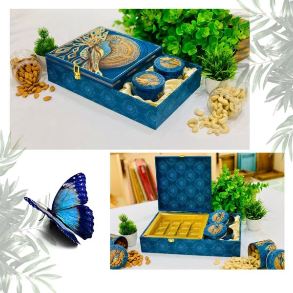 DRY FRUIT HAMPER This elegant and sophisticated dry fruit tray is a perfect blend of beauty and luxury. It features two beautiful glass jars, each adorned with intricately printed tin caps that add a touch of vintage charm. The jars are filled with a premium selection of dry fruits, meticulously chosen for their quality and flavor.