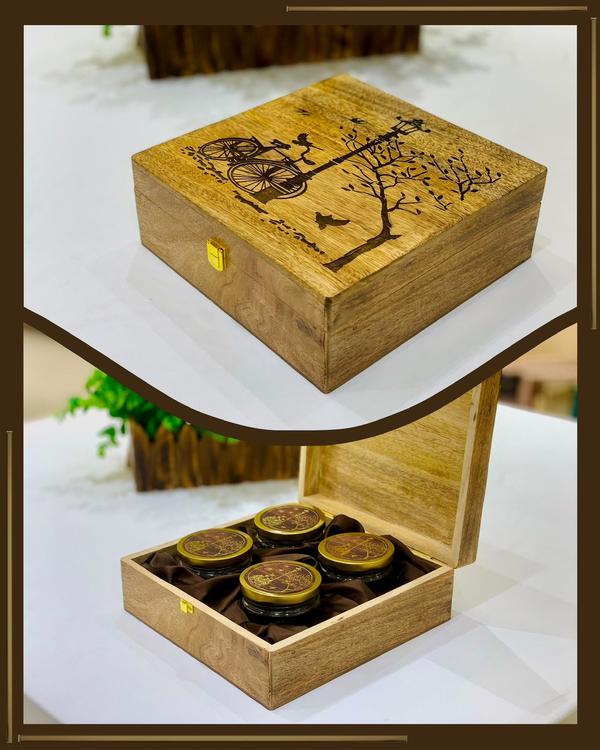 WOODEN DRY FRUIT BOX Gifting the memories with our exquisite wooden dry fruit gift box, This elegant box includes four glass jars with beautifully printed caps. Delight your loved ones with a gift that embodies taste, tradition, and health. Shop online today and add a touch of sophistication to your celebrations with our stunning dry fruit box.
